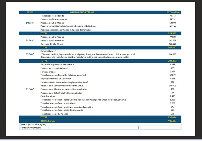 No Piauí, nas quatro fases da vacinação nacional, está previsto que 1.113.329 milhão de piauienses sejam vacinados, de acordo com dados mais recentes do Ministério da Saúde. Por outro lado, o governador esclarece que o quantativo faz parte da estratégia do Governo Federal, que pode ser alterado para que 100% do público-alvo seja vacinado.