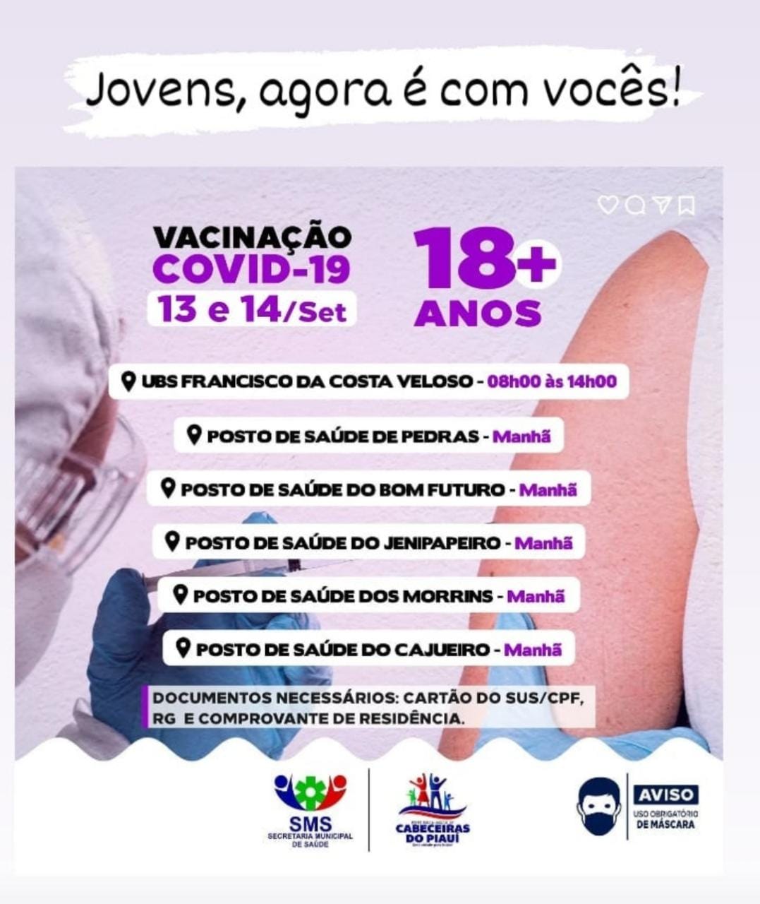 A prefeitura de Cabeceiras do Piauí através da secretaria municipal de saúde iniciará a vacinação dos jovens de 18 ou mais. A vacinação acontecerá nos dias 13 e 14 de setembro. Para realizar a imunização serão necessários os documentos como: RG, CPF, Cartão do SUS e comprovante.