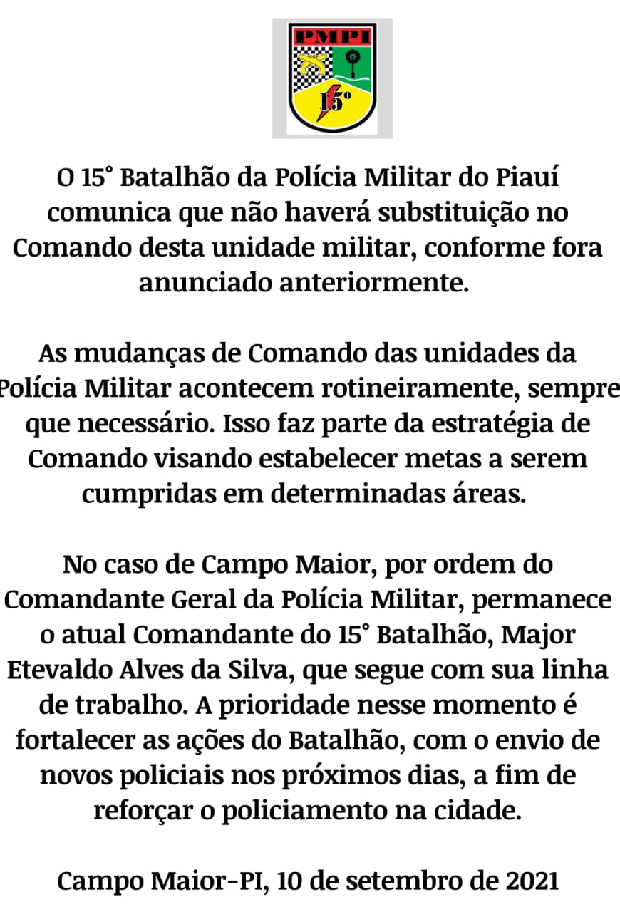 Por meio de nota na tarde desta quinta-feira (09/09), o major Etevaldo Silva informou que seguirá como comandante do 15º Batalhão da Polícia Militar de Campo Maior.