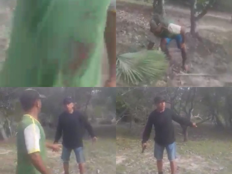 Em um certo momento do vídeo, o Policial chega a golpear uma das vítimas com o facão. A medida que a confusão se intensifica, outros envolvidos tentam acalmar o policial, mas a confusão aumenta quando um dos homens partem para cima do policial tentando tomar a arma e ele começa a atirar.