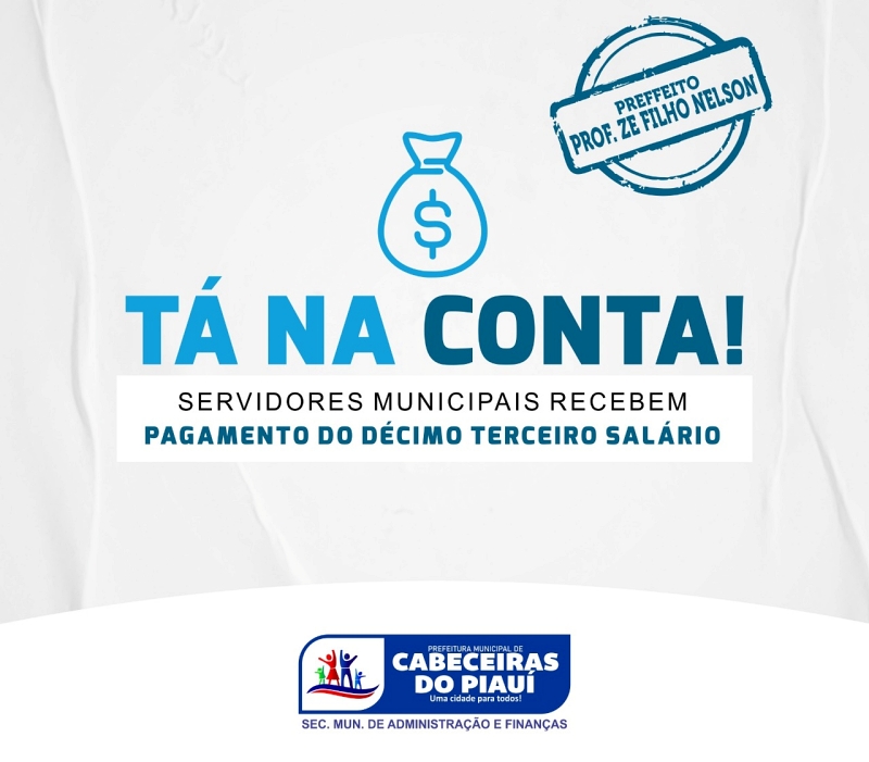 Nesta terça-feira, (14) a Prefeitura Municipal de Cabeceiras, através da Secretaria de Administração e Finanças realizou o pagamento do 13º salário de todos os servidores públicos municipais.