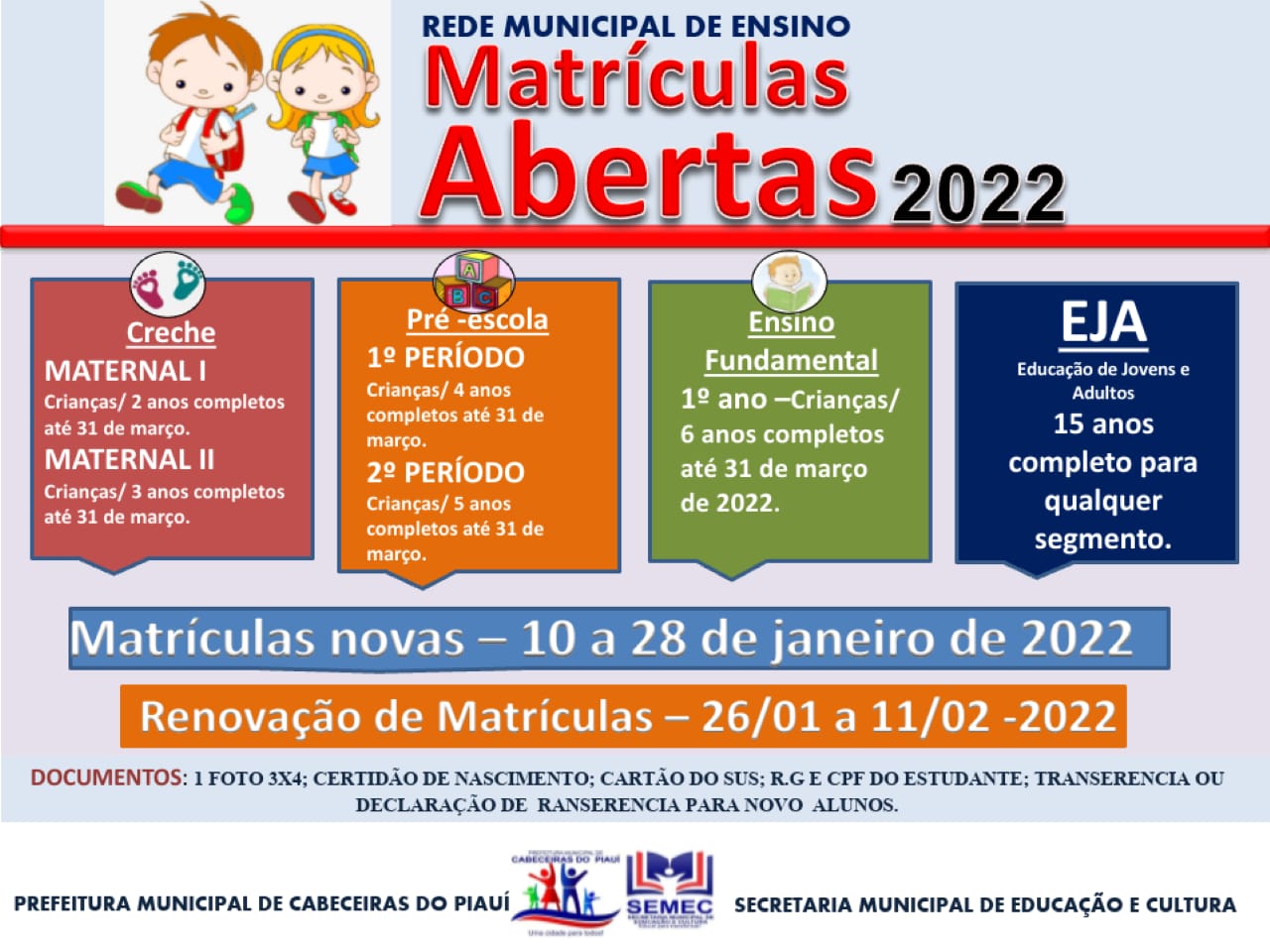 As matrículas para as aulas na da rede municipal de ensino segue até o dia 11 de fevereiro em Cabeceiras do Piauí.