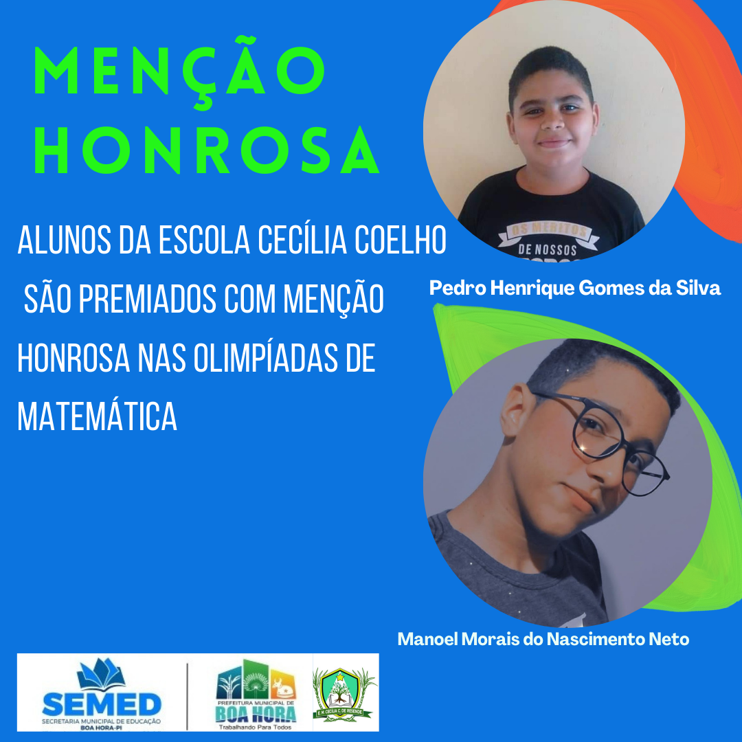 Dois estudantes da Escola Municipal Cecilia Coelho de Resende no município de Boa Hora fizeram bonito na 2ª fase da Olímpiada Brasileira de Matemática das Escolas Públicas (OBMEP), ao serem premiados com menção honrosa na edição de 2021. Trata-se de Manoel Morais do Nascimento Neto e Pedro Henrique Gomes da Silva.
