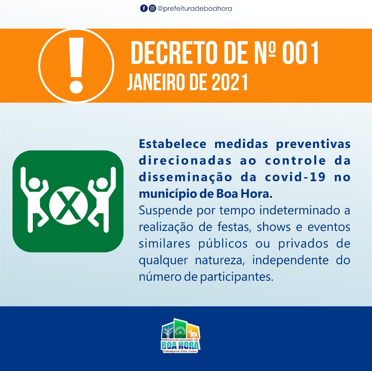 O decreto de Nª 001 de 22 de janeiro de 2021 estabelece medidas preventivas direcionadas ao controle da disseminação da covid-19 no município e suspende por tempo indeterminado a realização de festas, shows e eventos similares públicos ou privados de qualquer natureza, independente do número de participantes.