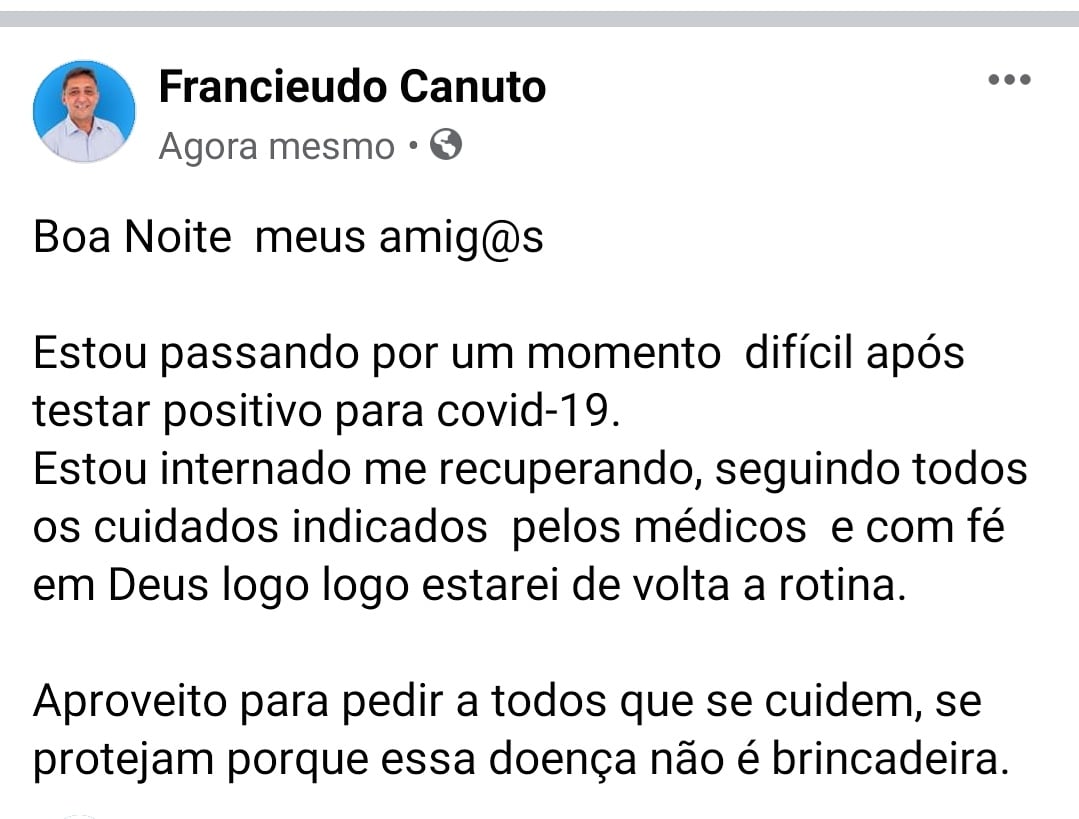 O prefeito relatou que sentiu sintomas da doença, fez o teste e o resultado foi positivo. Francieudo está internado e sendo acompanhado por uma equipe médica.