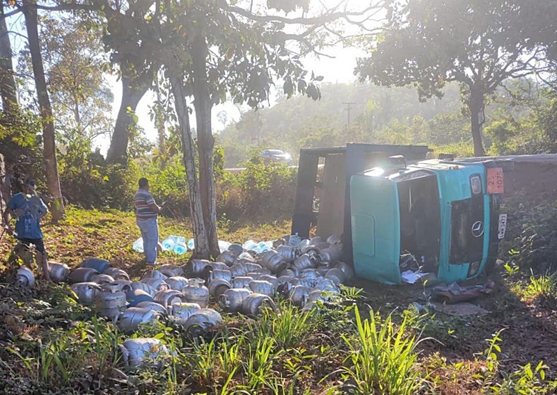 Um caminhão carregado de botijões de gás se envolveu em um acidente na manhã desta quinta-feira (18), na PI-113. O veículo saiu da pista e tombou, espalhando botijões pelo chão.