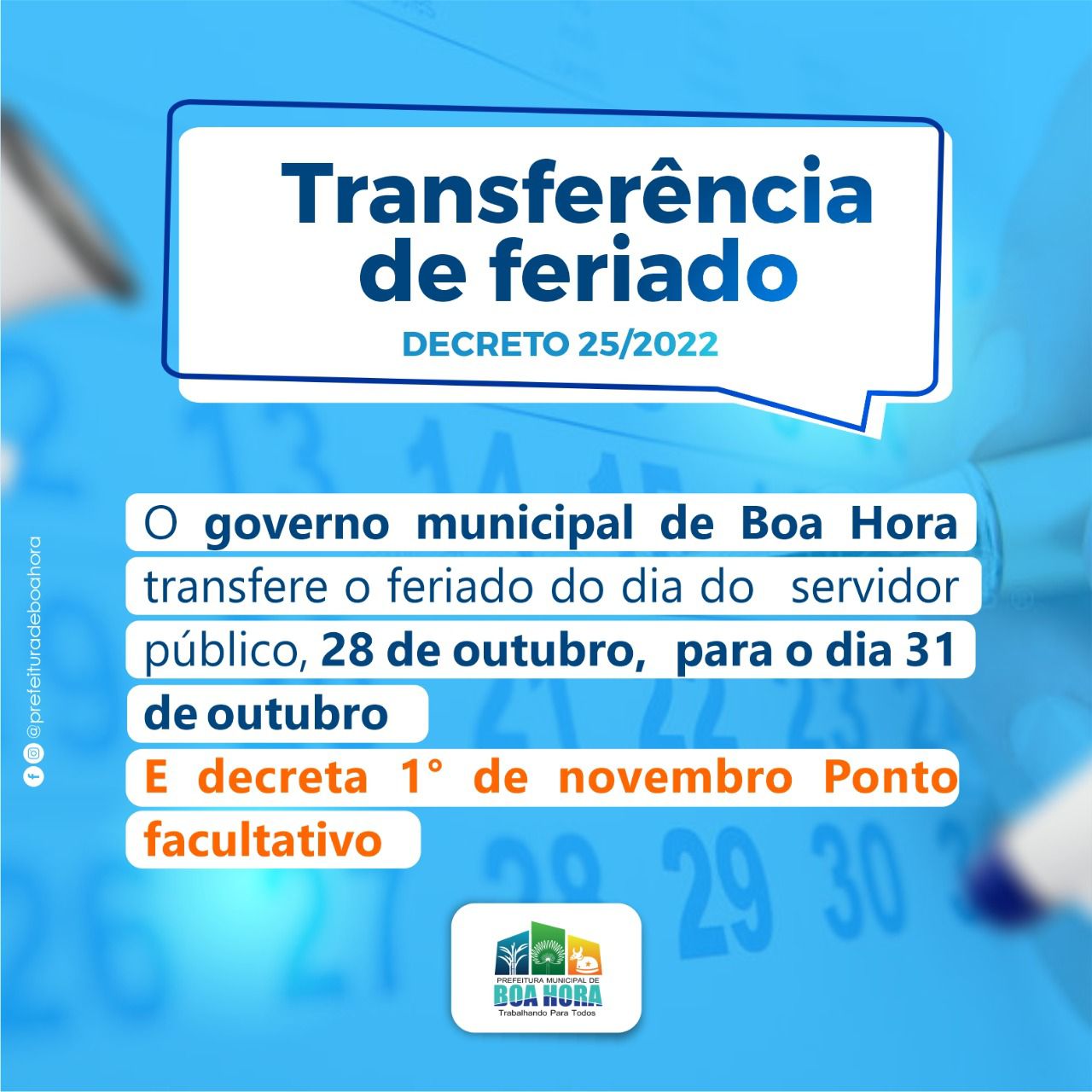 A Prefeitura de Boa Hora transferiu o feriado do Dia do Servidor Público, nesta sexta-feira (28), para o dia 31 de outubro, segunda-feira.
