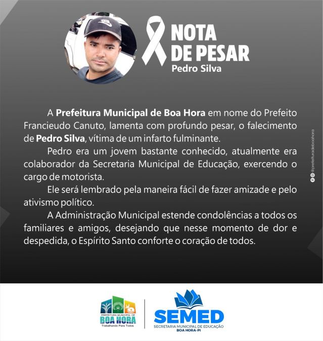 "É com muita tristeza que recebo a notícia da partida repentina do meu amigo Pedro lá do Bairro Mato Seco. Pedro era um jovem alegre, conversador de amizade fácil. Nesse momento de dor e despedida desejo que o Espírito Santo conforte o coração de todos os amigos e familiares", escreveu o prefeito.