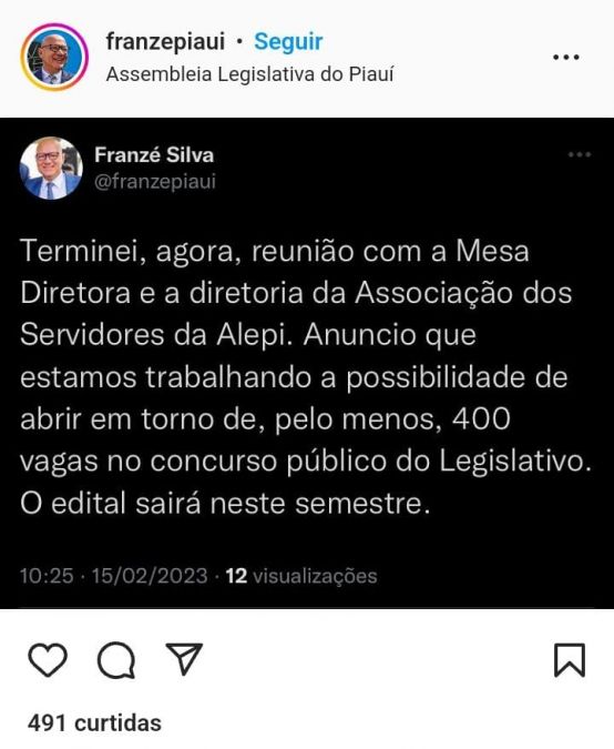 O deputado Franzé Silva, presidente da Assembleia Legislativa do Piauí (Alepi), anunciou nesta quarta-feira (15/02) que irá lançar o edital de concurso público ainda neste primeiro semestre de 2023 com, ao menos, 400 vagas no Legislativo.