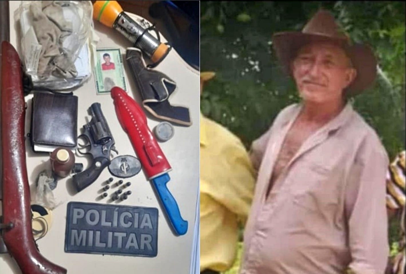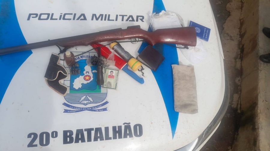 Em posse do indivíduo, que confessou o crime durante a abordagem policial, estavam os seguintes objetos: um revólver calibre 32, marca TAURUS, n° 653861, uma faca, várias munições e uma espingarda “bate-bucha”.