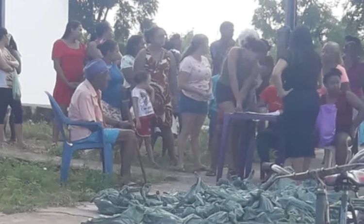 Imagens feita por moradores mostram várias sacolas no chão de uma calçada. Em outra foto, uma multidão se organiza retirando senha para pegar sua sacola de peixe, que está no chão e sem o condicionamento adequado.