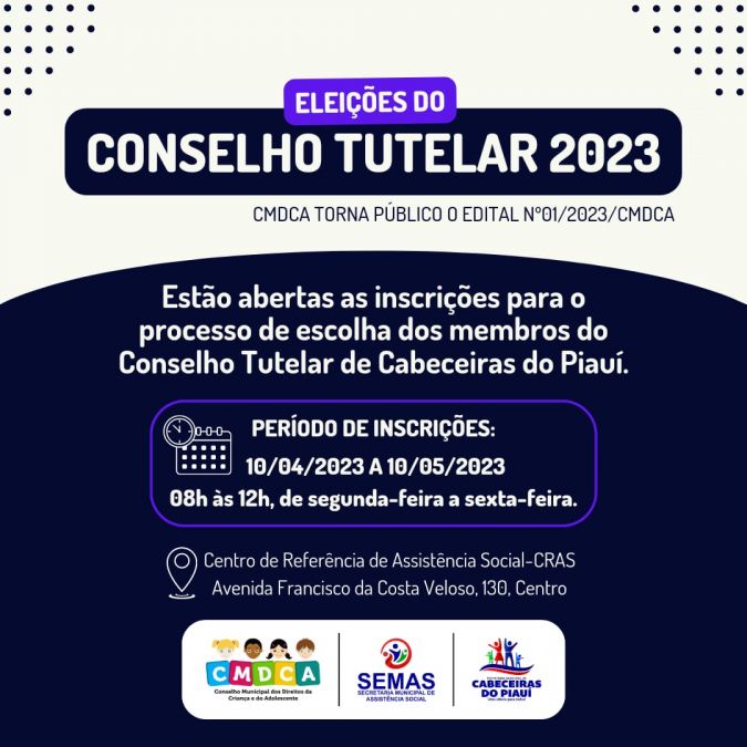 A Prefeitura Municipal de Cabeceiras do Piauí informa que foi publicado pelo Conselho Municipal dos Direitos da Criança e do Adolescente (CMDCA) o edital que prevê a escolha de membros do Conselho Tutelar de Cabeceiras do Piauí.