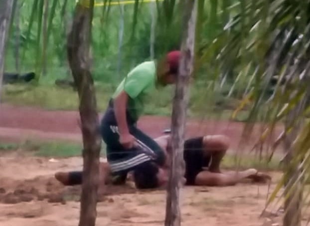 Os agentes foram acionados por moradores que relataram que o acusado estava agredindo a vítima e que ao se dirigirem ao local na tentativa de prestar socorro ao ferido, estes eram impedidos de se aproximar pelo próprio agressor, que estava armado com uma faca.