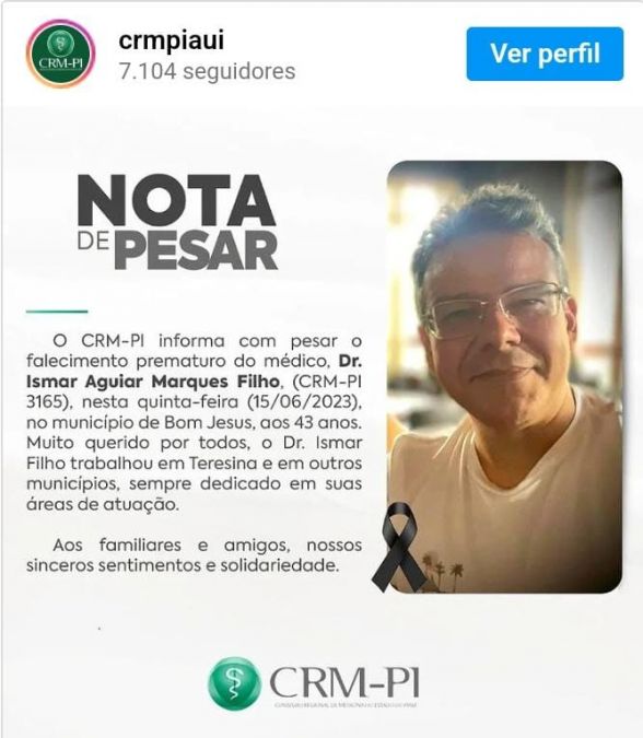 “O CRM-PI informa com pesar o falecimento prematuro do médico, Dr. Ismar Aguiar Marques Filho, (CRM-PI 3165), nesta quinta-feira (15/06/2023), no município de Bom Jesus, aos 43 anos. Muito querido por todos, o Dr. Ismar Filho trabalhou em Teresina e em outros municípios, sempre dedicado em suas áreas de atuação. Aos familiares e amigos, nossos sinceros sentimentos e solidariedade.”