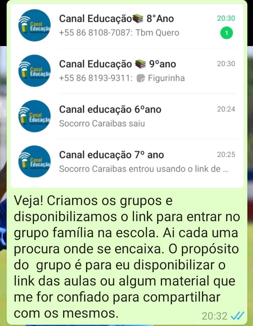 Isabel passou a divulgar nos grupos como funcionavam as aulas remotas e perguntou se alguém tinha interesse em acompanhar. Com ajuda da coordenação da escola, ela passou a disponibilizar os links. Nesse momento surgiu outra surpresa. "Meu alvo era o 9º ano. Mas aí veio a melhor parte: pais de outras séries e alunos me enviaram mensagens pedindo os links do 6ºano, 7º ano e 8º ano. Eu assumi o compromisso de todos os dias disponibilizar o link das aulas para eles", revela.