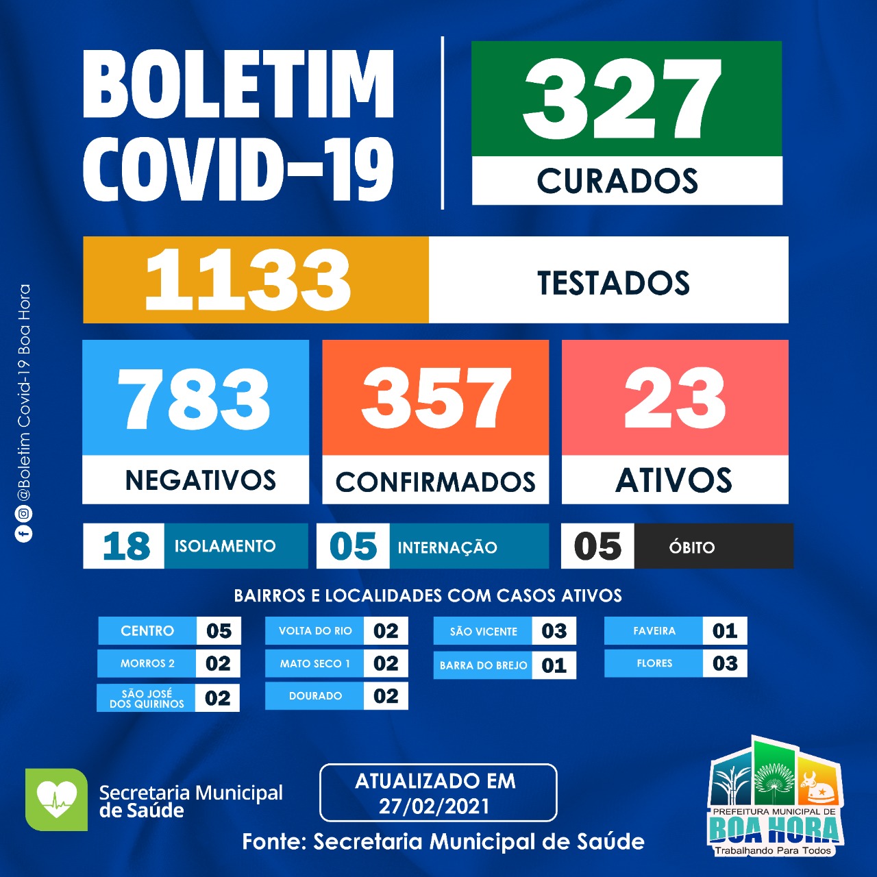 Boa Hora contabiliza 357 casos confirmados da doença, desses 327 estão curados. Existe no município 24 casos ativos da doença.