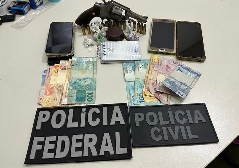 Na casa, foram encontrados uma quantidade de dinheiro em espécie, celulares, um caderno com toda a contabilidade da venda de drogas, trouxas com substâncias suspeitas, e ainda, um revólver calibre 38 e munições.
