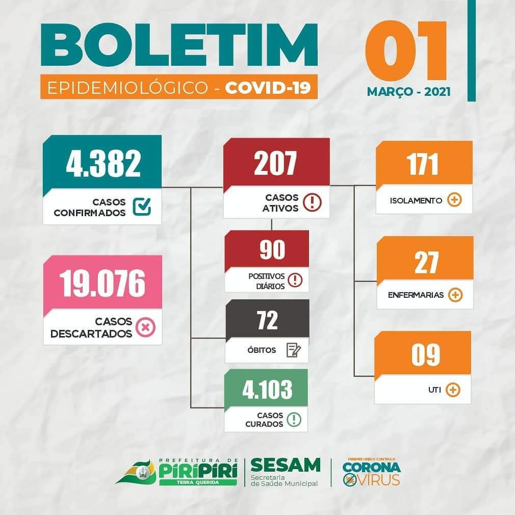 A cidade de Piripiri, no norte do estado, divulgou o último boletim epidemiológico na noite dessa segunda-feira dia 01/03 confirmando mais um óbito em decorrência da covid-19. Trata- se de uma mulher de 80 anos de idade com comorbidades, que estava internado no Hospital Regional Chagas Rodrigues.