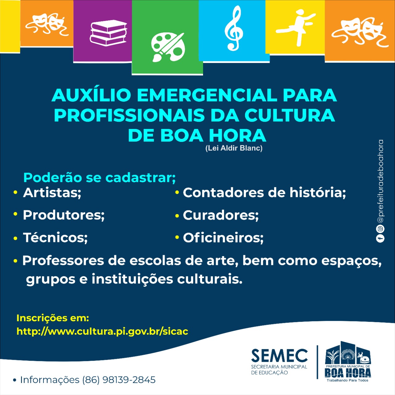 A Secretaria Municipal de Educação e Cultura de Boa Hora, comunica aos artistas de vários seguimentos culturais do município que os mesmo devem realizar o cadastro para recebimento do auxilio emergencial da cultura. Os artistas vão receber o auxílio de R$ 600 garantido pela Lei Aldir Blanc.