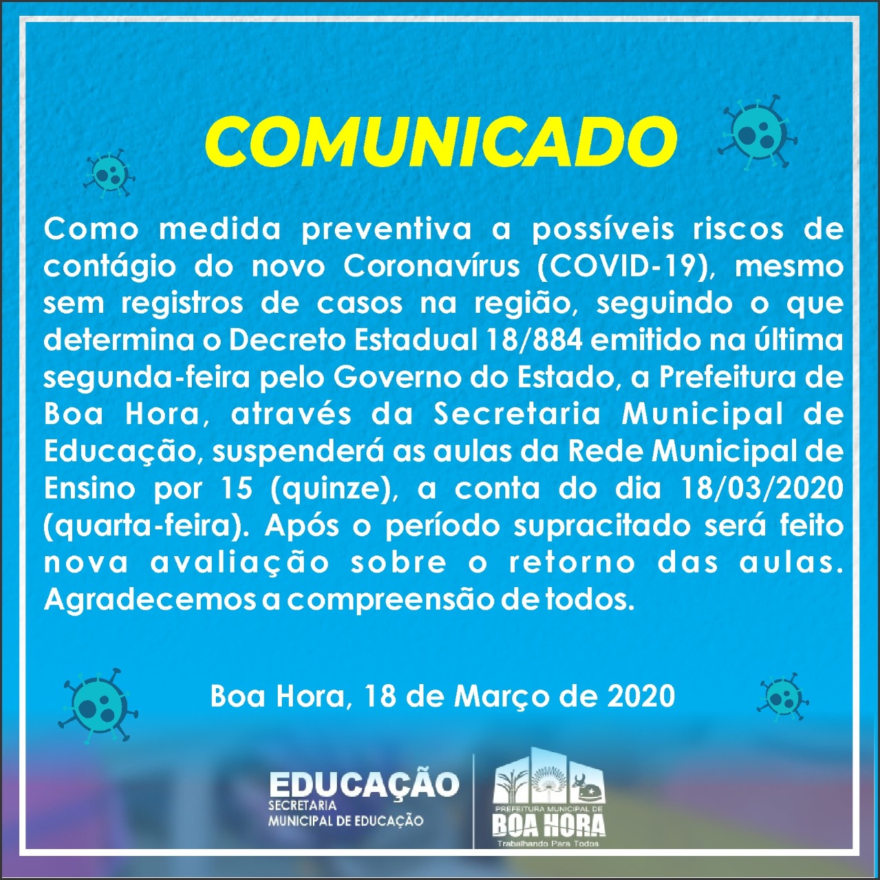 A Prefeitura de Boa Hora através da Secretaria Municipal de Educação suspendeu as aulas da rede municipal ensino. As atividades nas unidades ficarão suspensas a partir desta quarta-feira (18/03). A medida foi tomada para prevenir a possibilidade de infecção pelo novo coronavírus.