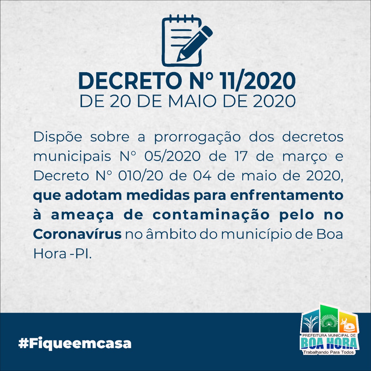 O Prefeito de Boa Hora Francieudo Canuto, através do Decreto Nº 11/2020 prorrogou as medidas de enfrentamento ao novo coronavírus no município até o dia 07 de junho.