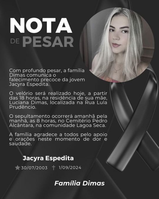 A familia divulgou uma nota informando o falecimento da jovem, mas não citou as causas.