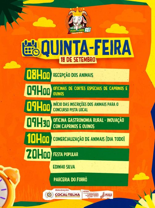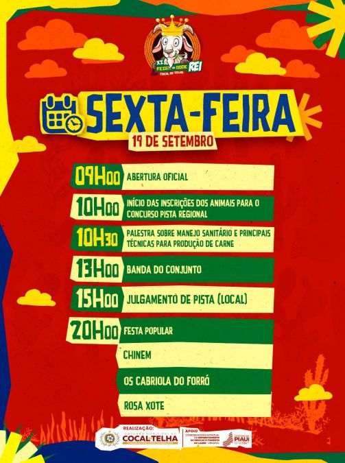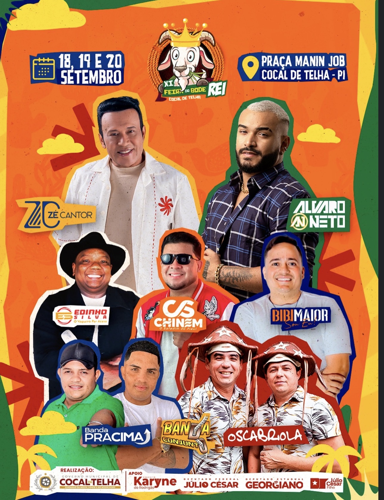 A XI Feira do Bode Rei, em Cocal de Telha, acontece nos dias 18, 19 e 20 de setembro e chega em 2025 com uma edição ainda maior e mais diversificada. O evento, já tradicional na cidade, reúne cultura, exposições e atividades ligadas ao agronegócio, atraindo moradores e visitantes da região.