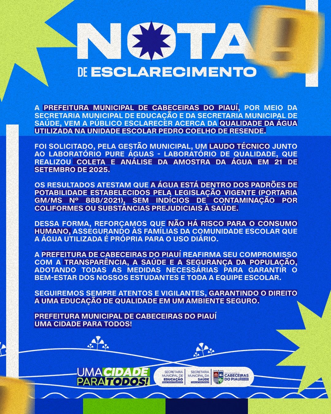 Diante da preocupação da comunidade escolar, a Prefeitura de Cabeceiras do Piauí informou, na manhã desta quinta-feira (02/10), que solicitou análise junto ao Pure Águas – Laboratório de Qualidade para verificar a situação.
