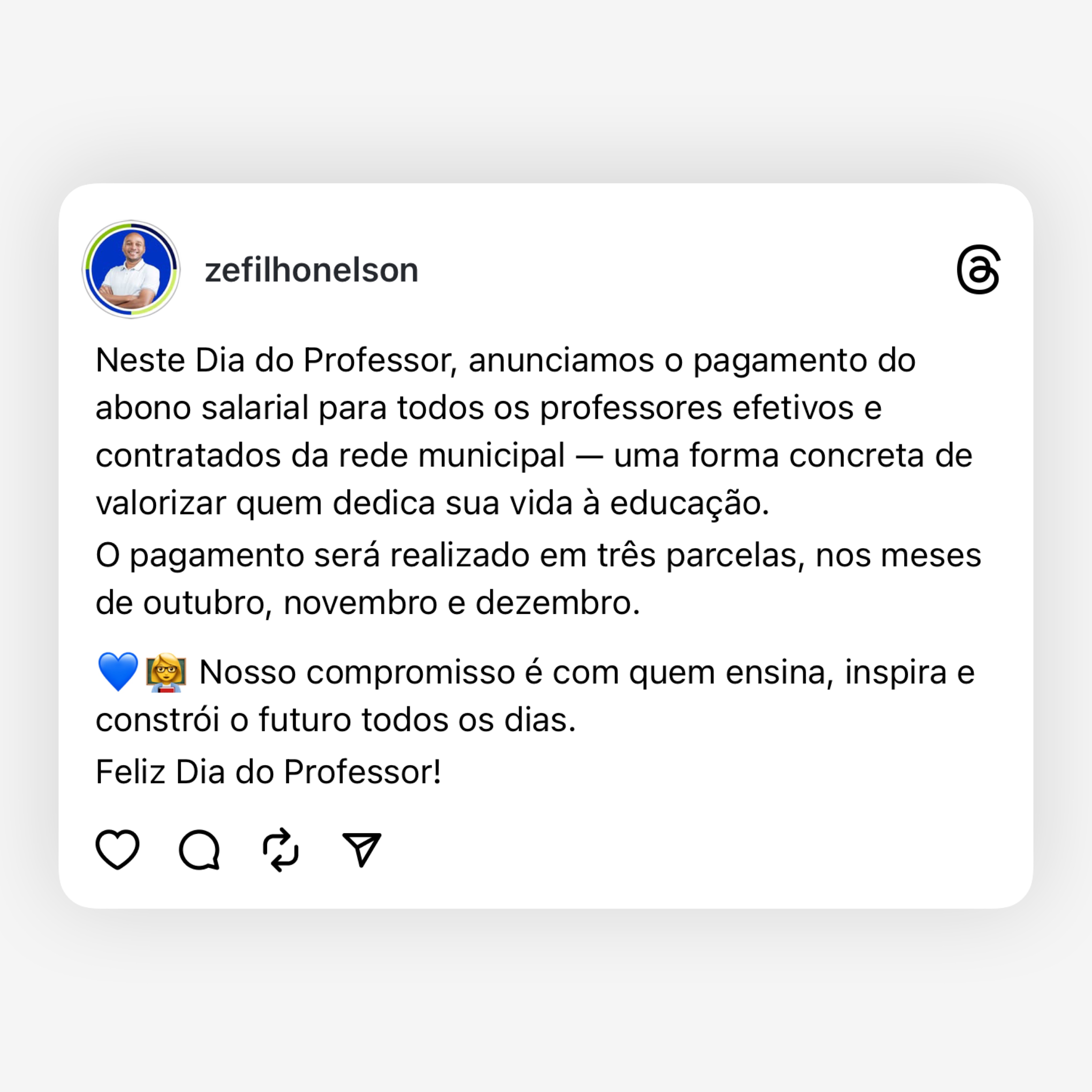 O prefeito de Cabeceiras do Piauí, professor Zé Filho, anunciou nesta quarta-feira (15), Dia do Professor, o pagamento de abono salarial para todos os professores da rede municipal, incluindo efetivos e contratados.