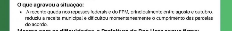 O débito, de acordo com a nota, havia sido renegociado, mas o pagamento das parcelas deixou de ser feito devido a uma suposta queda nos repasses do Fundo de Participação dos Municípios (FPM) entre agosto e outubro de 2025.
