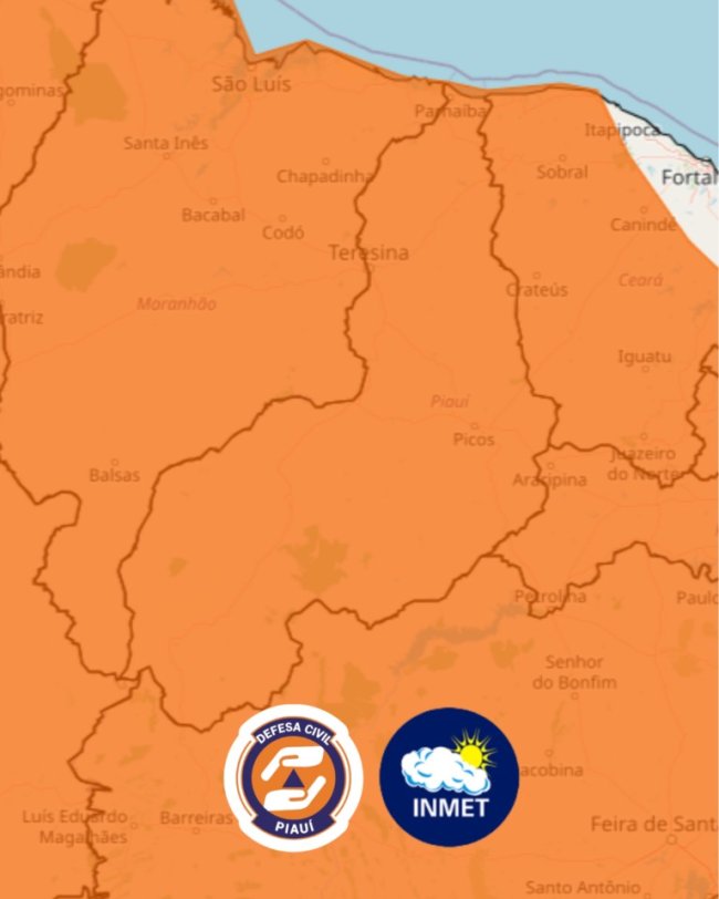 O Centro de Gerenciamento de Risco e Desastres da Defesa Civil (CEGRID), com dados do Instituto Nacional de Meteorologia (Inmet), alerta para a incidência de chuvas intensas no Piauí, nesta quinta (26) e sexta-feira (27). Um alerta laranja com grau de severidade de perigo potencial foi emitido com chuvas entre 30 e 60 mm/h ou 50 e 100 mm/dia, ventos intensos (60-100 km/h), risco de corte de energia elétrica, queda de galhos de árvores, alagamentos e de descargas elétricas.