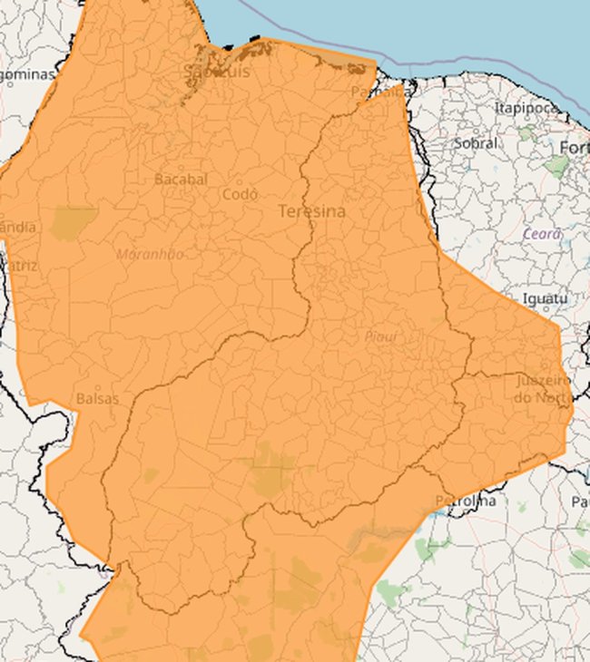 O Instituto Nacional de Meteorologia (Inmet) emitiu, nesta segunda-feira (19), um alerta laranja para 222 municípios do Piauí com perigo de chuva entre 30 e 60 mm/h e ventos intensos de até 100 km/h. Os temporais previstos para os próximos três dias são devido à Zona de Convergência Intertropical (ZCIT) e a convergência de umidade em baixos níveis.
