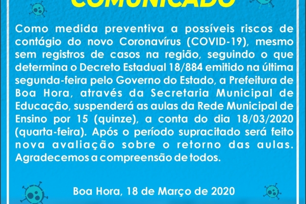 Prefeitura de Boa Hora suspende aulas e adota medidas de prevenção contra o coronavírus