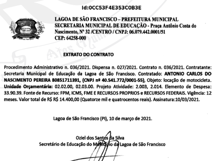 O contrato foi feito via dispensa de licitação, que teve como vencedor a empresa ANTÔNIO CARLOS DO NASCIMENTO PEREIRA, assinado pelo secretário de educação Oziel dos Santos Silva.