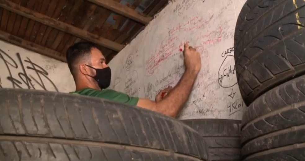 Sem dinheiro para comprar livros, Vladmir encontrou um jeito diferente para revisar o conteúdo e garantir boas notas. Nas paredes da borracharia, é possível observar os conteúdos que ele anotou.