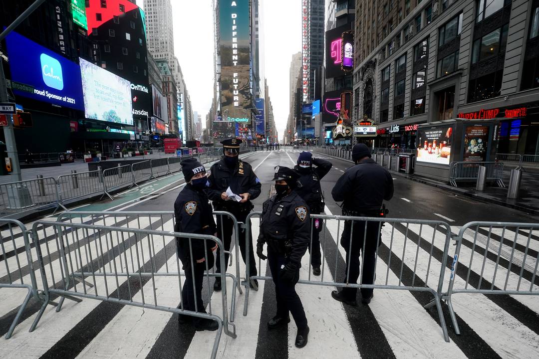 A Times Square, em Nova York, está isolada por policiais que barram a entrada das pessoas nos quarteirões ao entorno da praça. A festa será restrita a convidados (entre eles, algumas dezenas de profissionais da saúde, que serão homenageados) e os shows serão transmitidos pela internet.