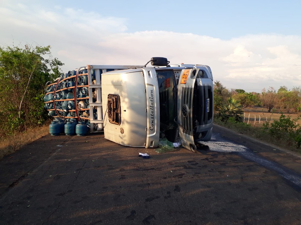 Um caminhão carregado de botijões de gás virou na PI 113.