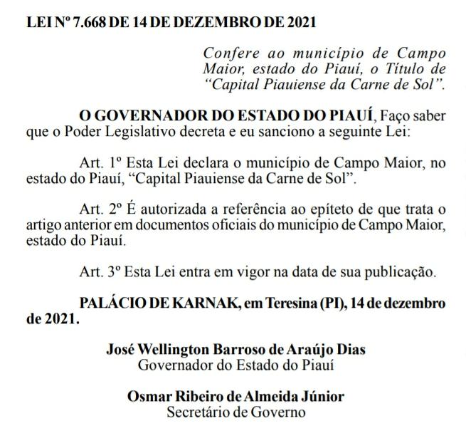 O governo do estado do Piauí promulgou a lei 7.668/2021 que confere ao município de Campo Maior, estado do Piauí, o Título de “Capital Piauiense da Carne de Sol”.