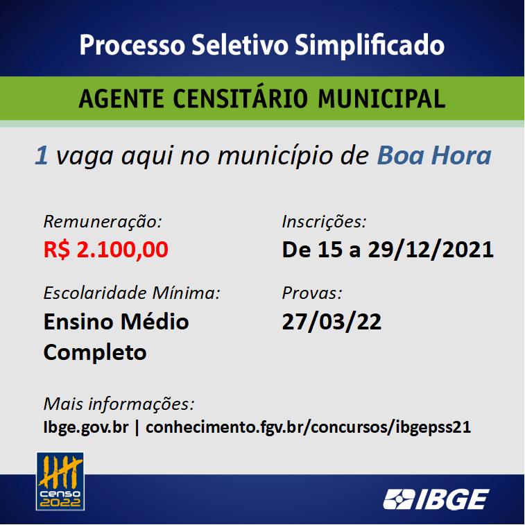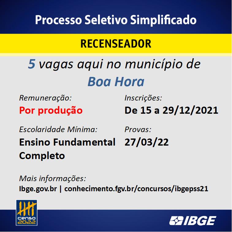 Em Boa Hora são oferecidas 5 vagas para o cargo de recenseador e 1 vaga para o cargo de Agente Censitário Municipal (ACM).