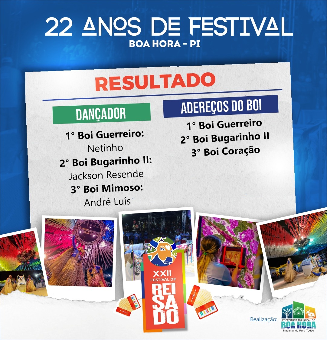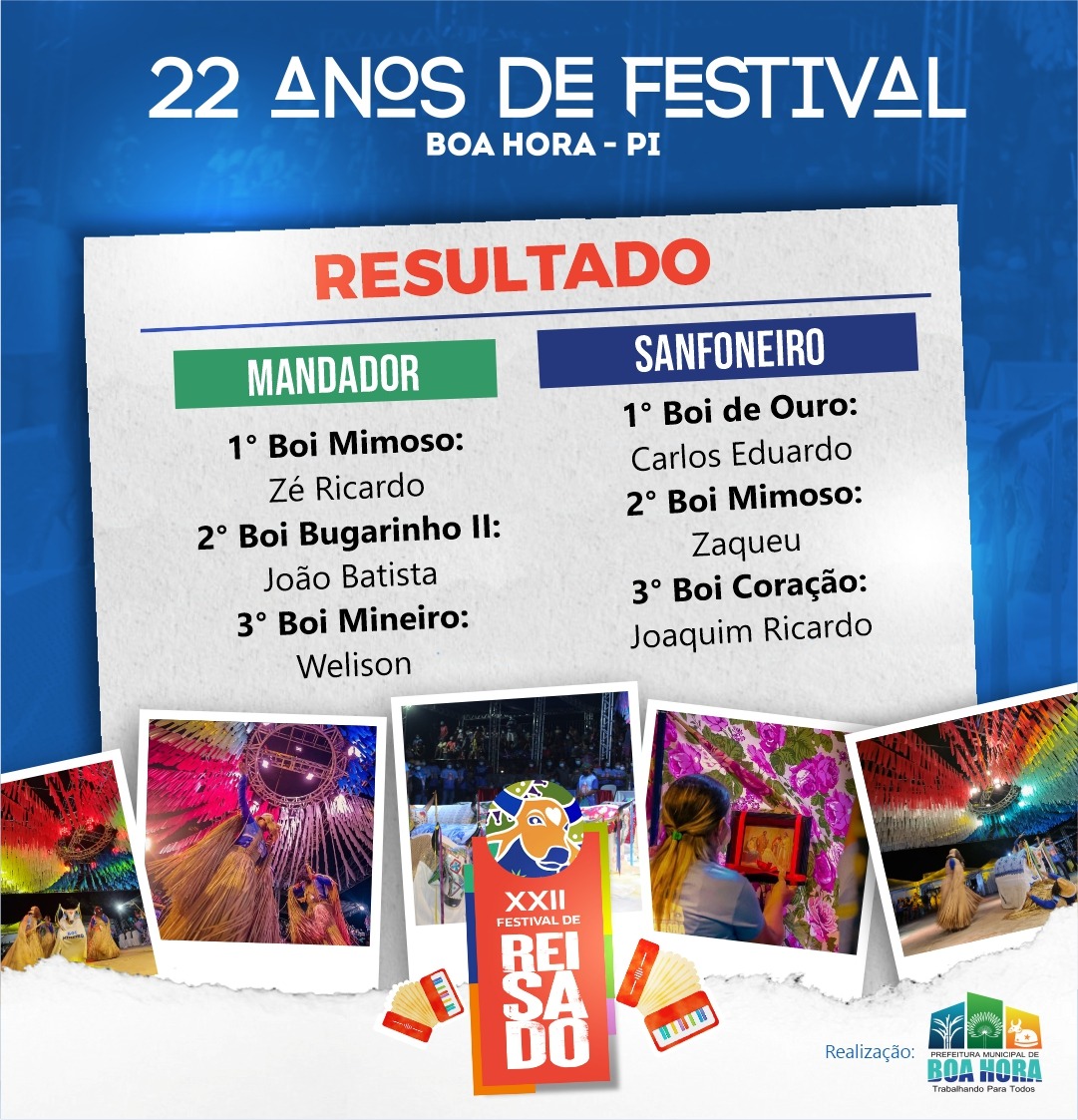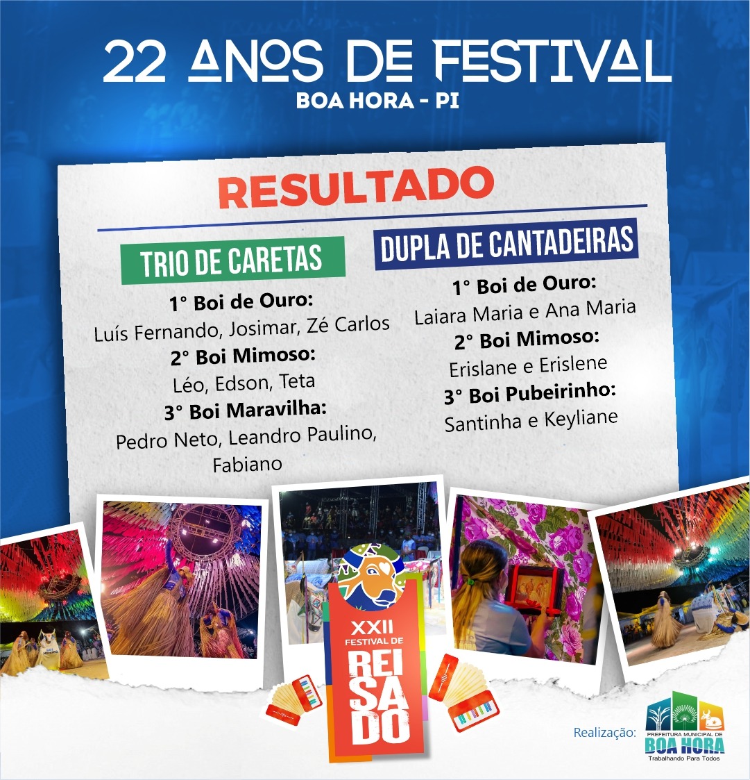 A Comissão Organizadora do XXII Festival de Reisado de Boa Hora divulgou através da Prefeitura Municipal a relação dos grupos de reisado e componentes vencedores nas categorias: Trio de Caretas; Dançador; Sanfoneiro; Mandador; Dupla de Cantadeiras e Adereços do Bois.