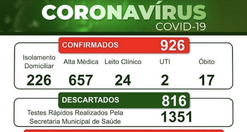 Os dados apontam que dos infectados, 519 mulheres e 407 homens. Desse total, 226 pessoas cumprem isolamento domiciliar, enquanto, 24 em leitos clínicos e dois em leitos de UTIs. Por outro lado, 657 pacientes já foram considerados recuperados desde o início da pandemia.