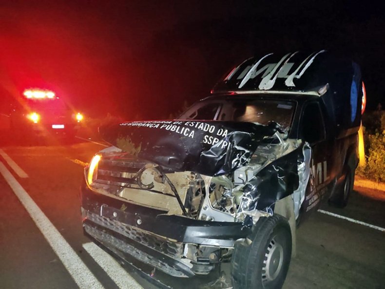 Uma viatura do Instituto Médico Legal (IML) ficou parcialmente destruída após atropelar dois animais na madrugada dessa segunda-feira (14), na BR-343, no município de Buriti dos Lopes, distante 281 quilômetros de Teresina.