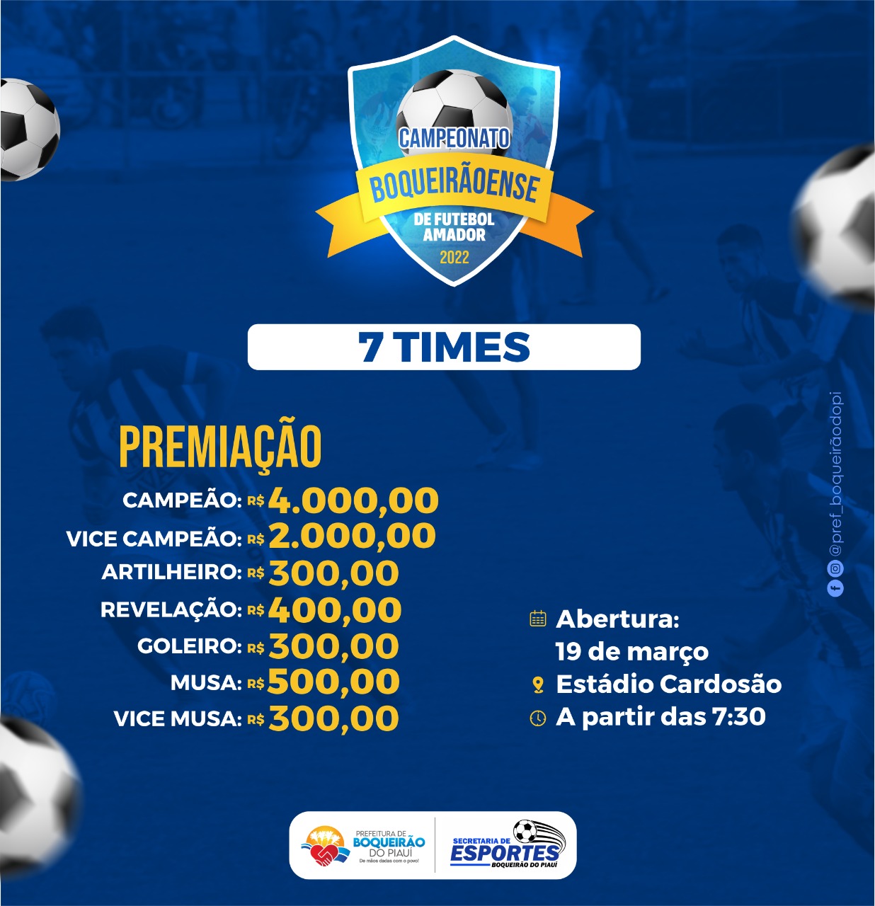 São sete times envolvidos na competição com mais de 7 mil reais em prêmio. O campeão vai levar 4 mil reais, o vice 2 mil. Receberão prêmios ainda, o artilheiro do campeonato, o jogador revelação, o melhor goleiro e a novidade do campeonato é que cada time será representado por uma garota que ao final será escolhida a musa do Boqueirãoense 2022.
