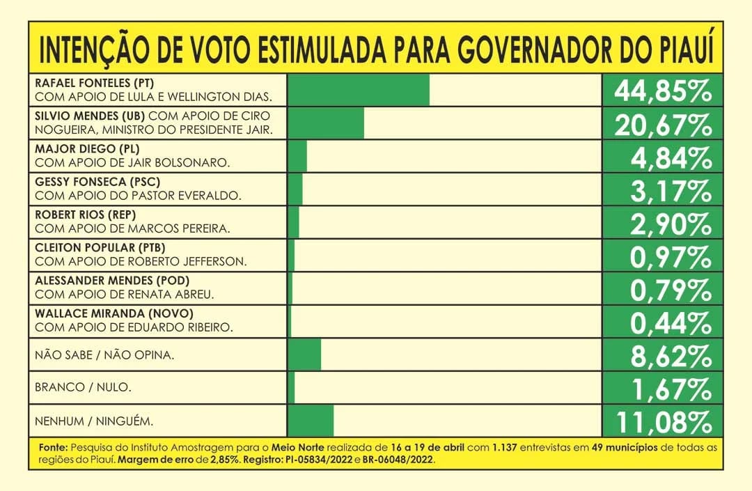 FICHA TÉCNICA – A pesquisa do Instituto Amostragem para o Grupo Meio Norte de Comunicação foi realizada de 16 a 19 de abril com 1.137 entrevistas com pessoas de 16 ou mais anos de idade residentes em 49 municípios de todas as regiões do Piauí.
