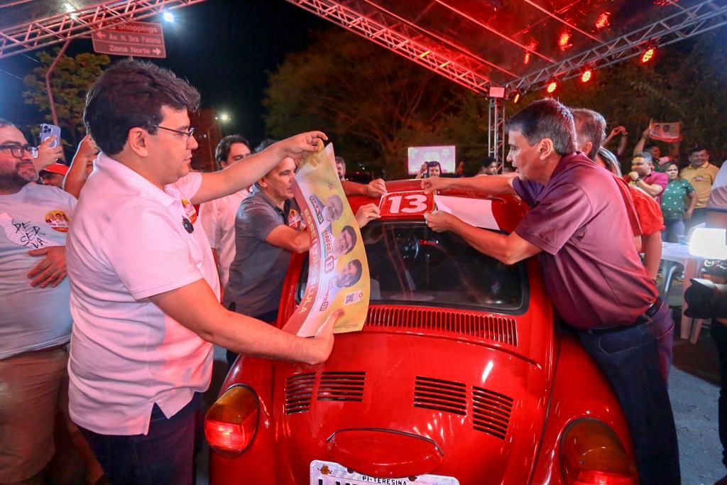 Os candidatos a governador, Rafael Fonteles (PT), e a senador, Wellington Dias, abriram a campanha eleitoral na madrugada desta terça-feira (16) com um evento na zona leste da capital. Os candidatos reuniram a militância para a adesivação de veículos como primeiro ato de campanha.