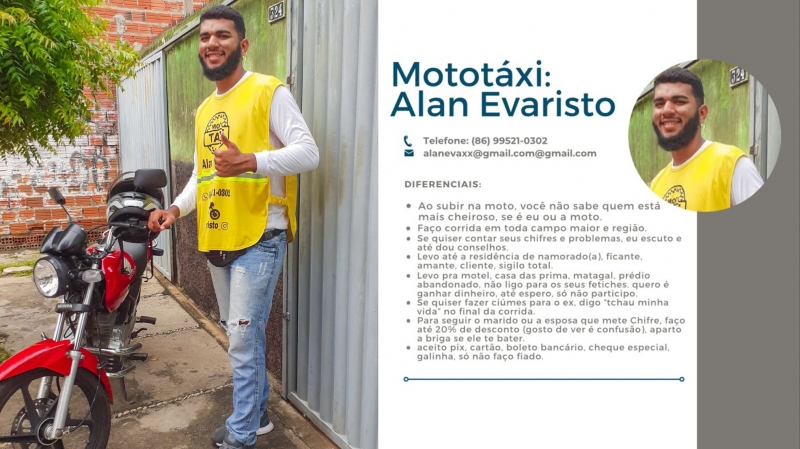 Um mototaxista de 20 anos viralizou nas redes sociais ao oferecer descontos para passageiros que precisarem “seguir marido ou esposa que mete chifre”. Natural de Campo Maior, cidade a 80 km de Teresina, Alan Evaristo de Sousa contou ao g1 que a ideia surgiu após presenciar uma discussão motivada por uma suposta traição.