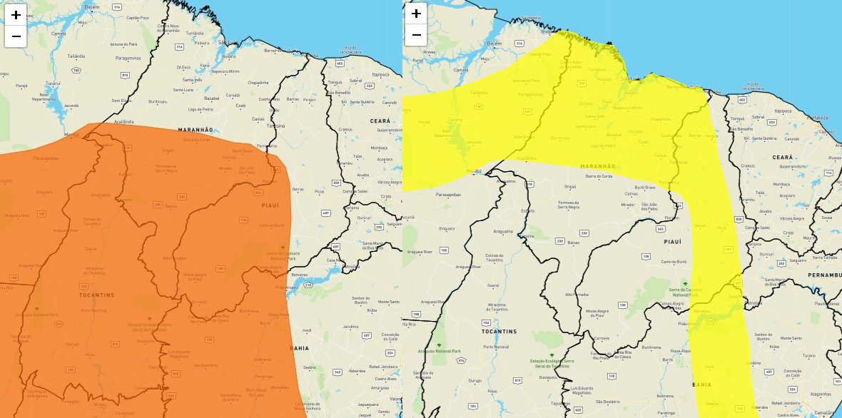 Novos alertas foram emitidos pelo Instituto Nacional de Meteorologia (Inmet) com previsão de chuvas intensas no estado. O alerta laranja, que representa maior perigo potencial de chuvas, foi emitido para 80 municípios da região Centro-Norte e Sudeste do Piauí. O alerta amarelo também prevê chuvas em 145 municípios do Norte e Sudoeste do estado.