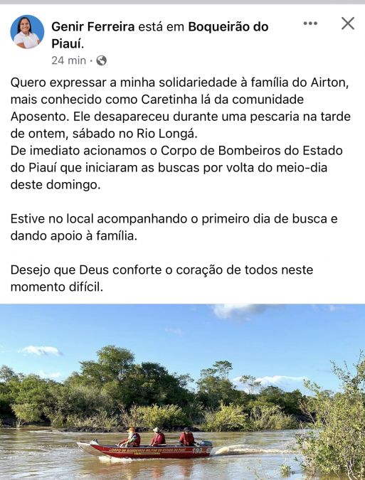 Em uma rede social, a Prefeita de Boqueirão do Piauí Genir Ferreira disse que está acompanhando as buscas e declarou solidariedade à família da vítima. A prefeita pediu ainda atenção da população durante banhos de rio nesse período chuvoso.