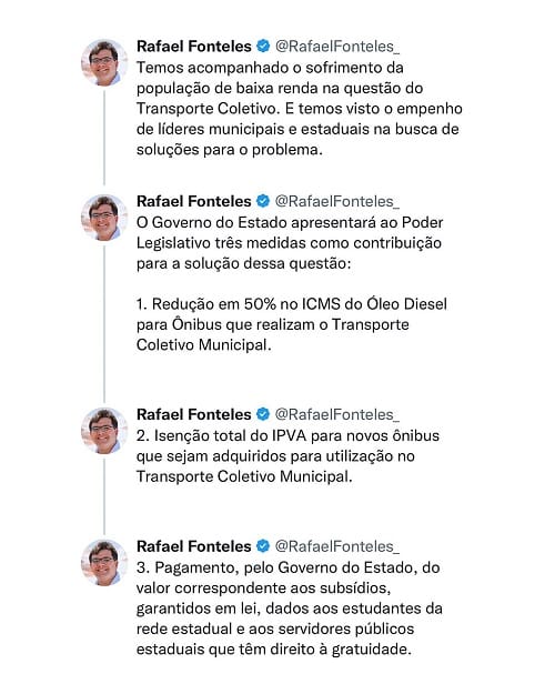 Rafael Fonteles enfatizou a preocupação com a situação atual do transporte público na capital e em especial com a população de baixa renda, que precisa diariamente do transporte público para chegar ao trabalho, escola, universidade e realizar tratamentos de saúde.