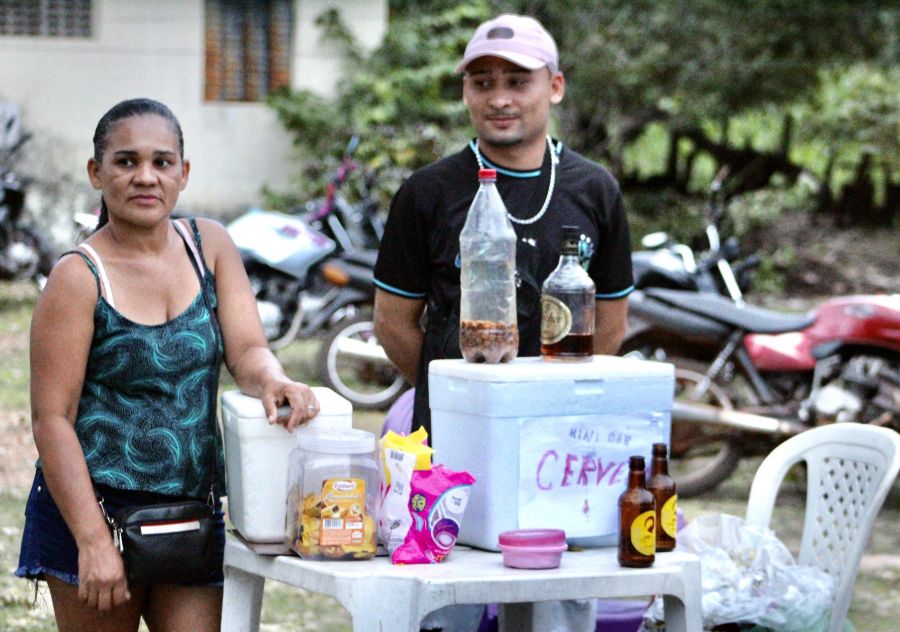 A moradora explica que levou de tudo um pouco para vender em sua banquinha. “Aqui tem desde cachaça da terra, cerveja, bombons, geladinho e petisco. Eu vendo creme de galinha e aqui deu pra ganha um trocado bom”, explica sorridente a vendedora.